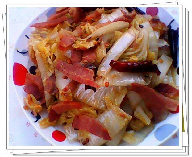 及以下步骤:肉片捞起沥干备用。 锅烧热,放入肥的火腿肉翻炒至透明出油。 将干辣子折半放入油锅翻炒。 待干辣子炒至红黑色出香味后,放入处理好的火腿肉片。 肉片逐渐变色,香味四溢。 先放入白菜梆子翻炒。 待白菜炒至出水可盖上锅盖中火焖3分钟左右。 再放入白菜叶子。 继续中火翻炒,烧焖1-2分钟。 出锅装盘。