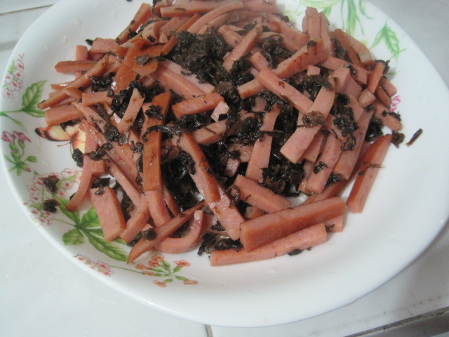 及以下步骤:霉干菜用清水浸泡30分钟 霉干菜少许 霉干菜用清水浸泡30分钟 霉干菜少许 霉干菜用清水浸泡30分钟 霉干菜少许 霉干菜用清水浸泡30分钟 火腿肠半根切丝 油热后放入火腿丝翻炒,加适量盐 再放入泡好拧干水份的霉干菜,翻炒,可加适量水。起锅前加入少量糖。