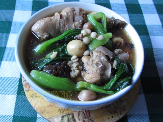 及以下步骤:将薏仁、花生仁、莲子和黑木耳都倒入高压锅 加入昨天已经处理过的的鸡腿和鸡汤盖盖,并加气阀叫几声后关火,让气自然回落。 拿去气阀开盖,加入少许生抽 加一茶匙的食盐调味后,虚掩盖子炖一会儿 加洗净的小青菜几株,待青菜断生即可 出锅盛入碗内 拿去气阀开盖,加入少许生抽 加一茶匙的食盐调味后,虚掩盖子炖一会儿 加洗净的小青菜几株,待青菜断生即可 出锅盛入碗内