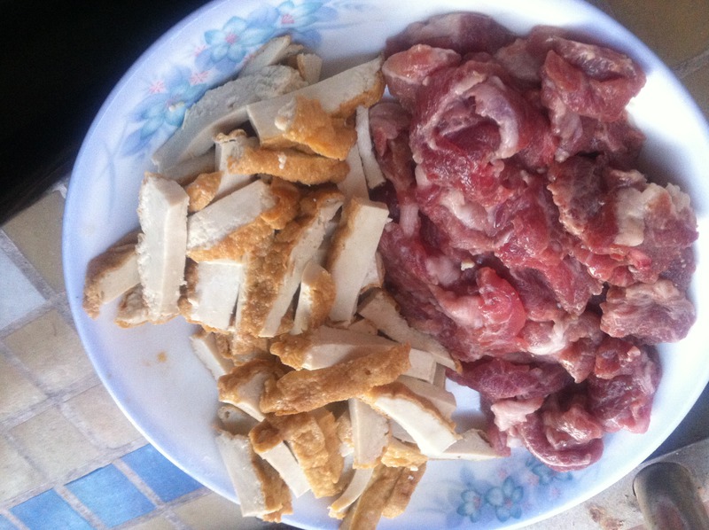1、猪肉切片先用麻油和生粉拌匀!咸豆干切片!