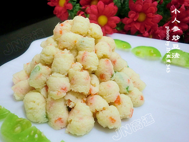 及以下步骤:再翻炒几下使之均匀即可。 炒好的豆渣装入裱花袋,挤成小粒状即可。这样可以使孩子也喜欢吃。 准备好做豆浆滤除的豆渣。 胡萝卜洗净切丝后剁碎。 锅置火上加入色拉油。油温7成热时放入葱花炸香。 再放入胡萝卜翻炒至变色。 再放入豆渣翻炒均匀。 加入盐。 再翻炒几下使之均匀即可。 炒好的豆渣装入裱花袋,挤成小粒状即可。这样可以使孩子也喜欢吃。