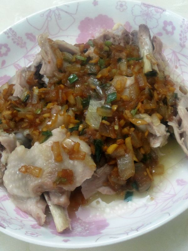 及以下步骤:热锅下油,放入姜葱等配料中火慢慢炒香。 加入生抽炒到味道和均。 酱料炒好淋到鸡肉上即可。 准备配制酱料:姜,洋葱和青葱切碎。 鸡肉蒸好了出锅放稍凉待切。 切的鸡肉,凑和能吃。(到处飞溅,吓死我了) 盘中的汤汁盛起可以用来做汤或煮面等。 热锅下油,放入姜葱等配料中火慢慢炒香。 加入生抽炒到味道和均。 酱料炒好淋到鸡肉上即可。