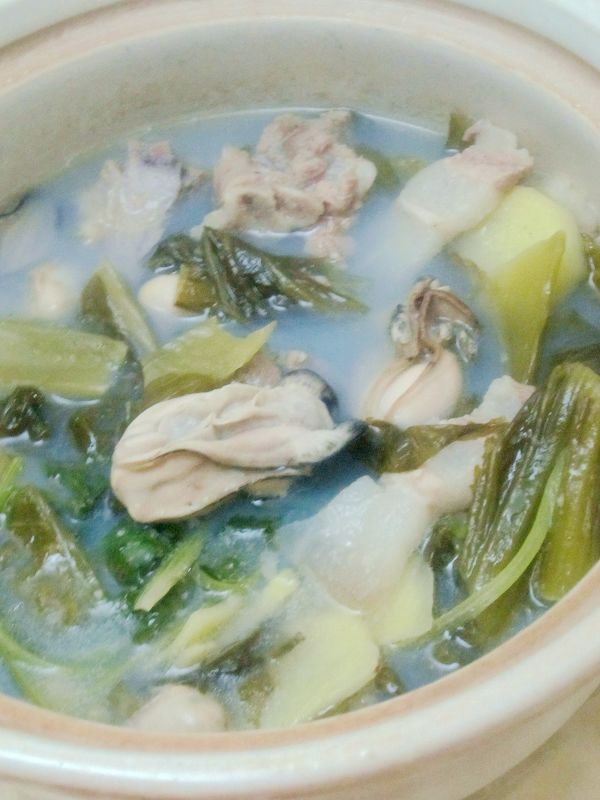 2、加入肉类合煮,可缓解蚝和酸菜的消食作用。