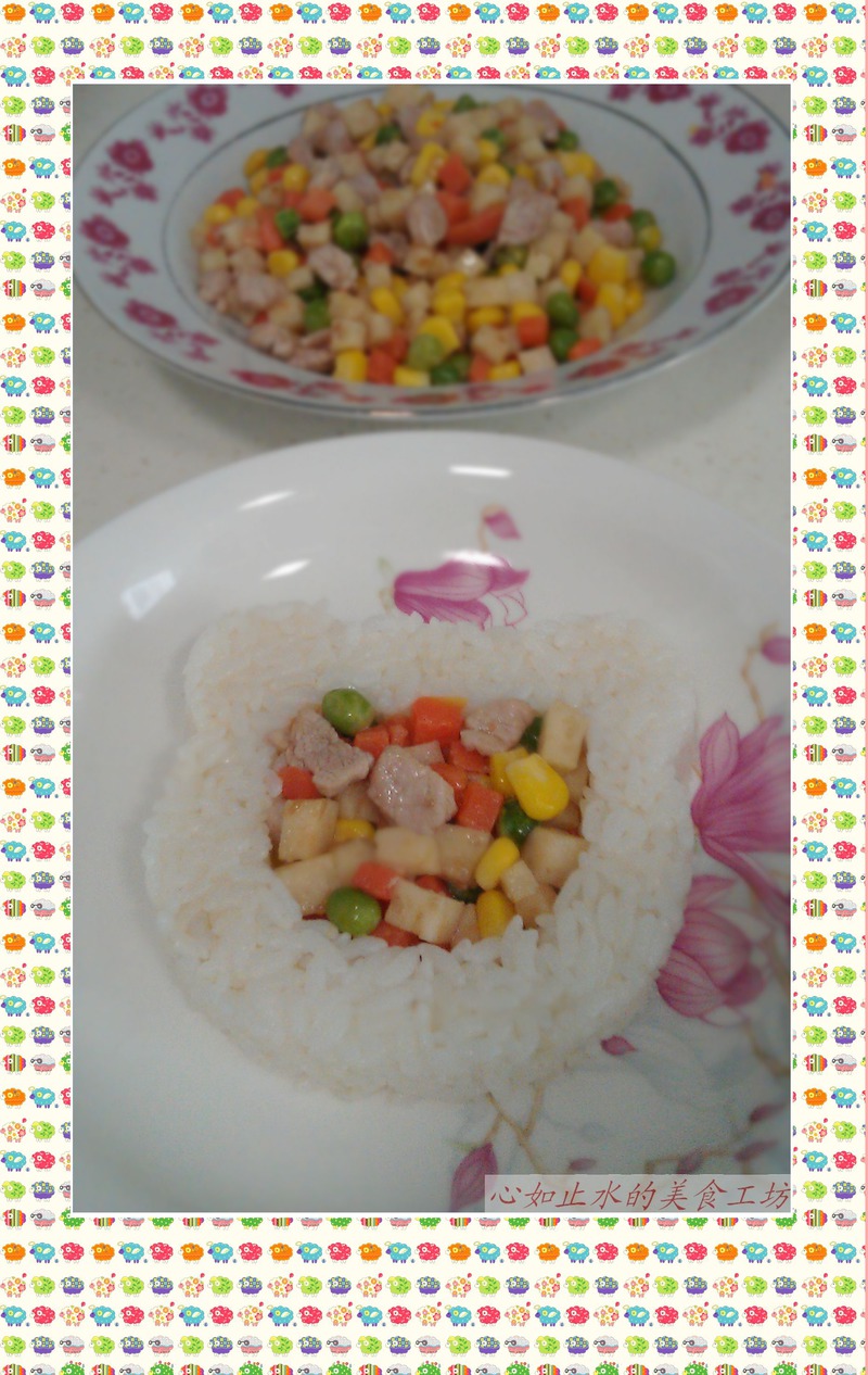 及以下步骤:摆好模具,将周围填上米饭,这个步骤一定要细心加耐心 锅内适量油,将除米饭以外的所有材料炒熟,加少许盐,很好看的五彩丁哦 摆好模具,将周围填上米饭,这个步骤一定要细心加耐心 锅内适量油,将除米饭以外的所有材料炒熟,加少许盐,很好看的五彩丁哦 摆好模具,将周围填上米饭,这个步骤一定要细心加耐心 锅内适量油,将除米饭以外的所有材料炒熟,加少许盐,很好看的五彩丁哦 摆好模具,将周围填上米饭,这个步骤一定要细心加耐心 锅内适量油,将除米饭以外的所有材料炒熟,加少许盐,很好看的五彩丁哦 摆好模具,将周围填上米饭,这个步骤一定要细心加耐心 把米饭倒扣在盘子里,小心的移去模具,中间填上五彩丁