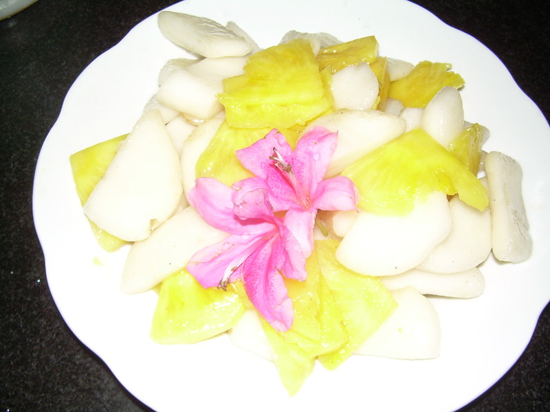 及以下步骤:装盘了。 摘了两朵杜鹃,增加些春天的气息。呵呵。 菠萝切片,用晾凉的盐开水浸泡半小时,沥去水分备用。(以前也试过不泡直接炒的,很酸。所以最好先提前泡好再炒。) 白馃,洗净切块备用。(在福州我们管它叫白馃,条状的。相当于其他地方的年糕吧。) 锅中放少许油,油热倒入白馃翻炒。 加入白糖继续翻炒。 等糖融化时倒入菠萝翻炒。 倒入菠萝翻炒10秒即可关火。(炒九了菠萝会太酸。) 装盘了。 摘了两朵杜鹃,增加些春天的气息。呵呵。