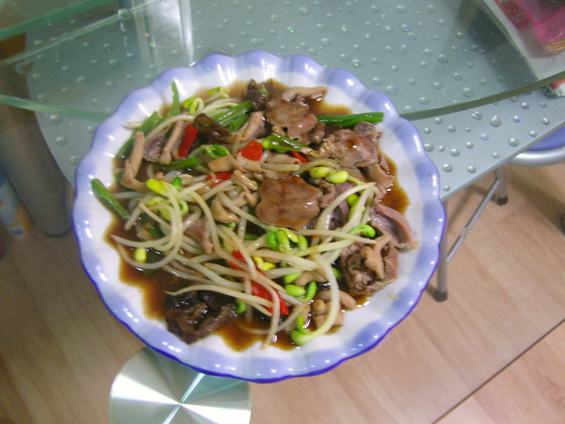 及以下步骤:青红椒,洋葱,木耳切得时候比对切好的鸭杂大小,力求错落有致,具一定美感 热油锅 鸭肠,青红椒,黄豆芽,木耳,洋葱先下锅,热油爆炒,可稍加一点点盐 下鸭胗,鸭心 爆炒后加盐,鸡精起锅装盘 汤汁留锅内 加玉米淀粉糊,蚝油,可乐,黑胡椒粉勾芡 倒在炒好的菜上即可。五颜六色很有食欲吧! 加玉米淀粉糊,蚝油,可乐,黑胡椒粉勾芡 倒在炒好的菜上即可。五颜六色很有食欲吧!