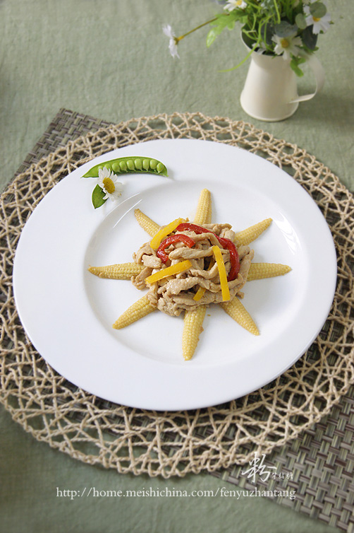 及以下步骤:锅下清水烧开后放入玉米笋焯水。 将玉米笋捞出过冷河沥干水份备用。 另锅下油爆香蒜粒和黄红椒丝。 把拌好的鸡柳放入锅里,用筷子划散,加入玉米笋、1汤匙豉油鸡汁翻炒均匀。 然后加入鸡精1茶匙、盐1茶匙炒匀即可上盘。 盘边放上盘饰,然后将炒好的玉米笋放成花型,鸡柳和黄红椒丝放中间即可。 另锅下油爆香蒜粒和黄红椒丝。 把拌好的鸡柳放入锅里,用筷子划散,加入玉米笋、1汤匙豉油鸡汁翻炒均匀。 然后加入鸡精1茶匙、盐1茶匙炒匀即可上盘。 盘边放上盘饰,然后将炒好的玉米笋放成花型,鸡柳和黄红椒丝放中间即可。