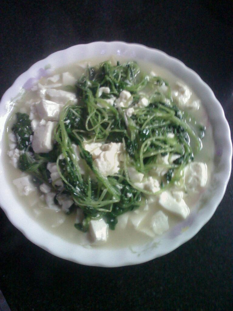 及以下步骤:萝卜芽洗净 豆腐一盒 萝卜芽洗净 豆腐一盒 萝卜芽洗净 豆腐一盒 热锅入猪油少许 萝卜芽入锅炒出水 再倒入豆腐,加盐,鸡粉少许 烧至滚开即可