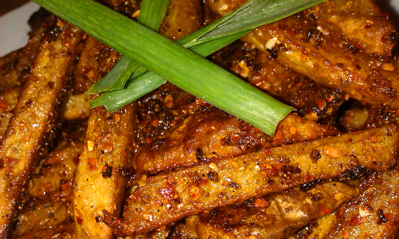 及以下步骤:土豆洗净,去皮,改刀切成一指宽的长条。 起锅做油,有多点(实耗很少)! 土豆洗净,去皮,改刀切成一指宽的长条。 起锅做油,有多点(实耗很少)! 土豆洗净,去皮,改刀切成一指宽的长条。 起锅做油,有多点(实耗很少)! 将土豆条入锅炸至金黄色! 在锅里留少许油,将咸盐,花椒粉,白糖,(喜欢孜然的,还可以加些孜然的),在锅内翻炒! 加入辣椒面继续翻炒。 成了,出锅!
