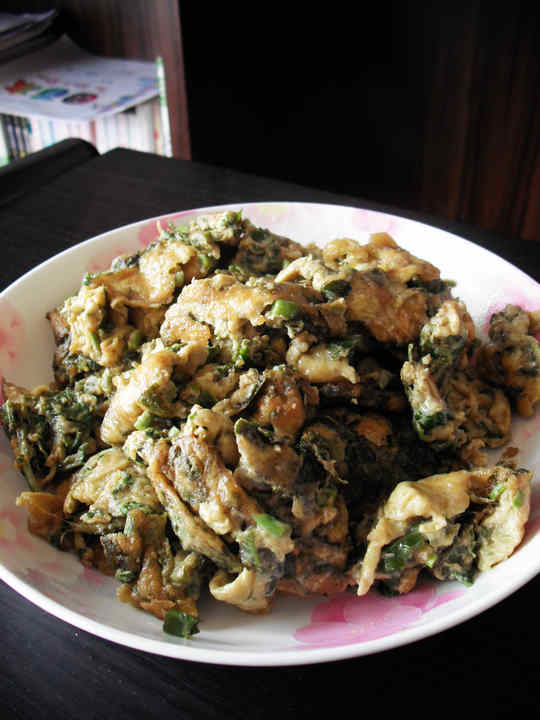 椿芽,是香椿树的嫩芽,在春暖花开的时候,带着春的气息走上老百姓的餐桌。每年椿芽上市了,都要买来,或炒鸡蛋,或拌凉菜,有时候也会加在面条里提香。椿芽便宜时,也会多买一点,也会加点咸盐给做成咸菜,就着稀饭馒头,别有一番香味。春天,不吃椿芽,似乎不能成其为真正的春天。 香椿鸡蛋,大概是家家户户都会做来吃的佳肴。买了两小把香椿,6.8元一斤,比起前几天的几十元十几元一斤,这个价格算是很便宜了。香椿很嫩,散发着特有的清香。于是忙不迭地磕了几个乌鸡蛋,炒了香香的一盘。