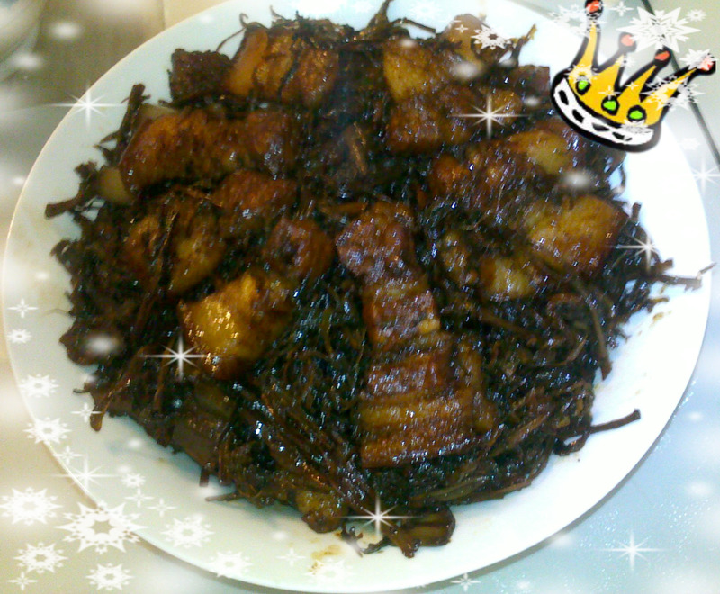 7、继续翻炒,然后加入梅干菜(挤干水分),再加入200ml开水,盖上盖子闷,水干再加开水,直到五花肉熟烂。出锅时放盐,老公不喜欢用鸡精,所以没加。