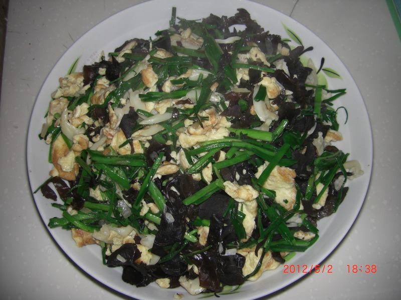 6、鸡蛋炒好后不必盛出来,继续放在锅里即可。然后下入葱花和姜末,稍微炒出香味(个人体会:此时一定要把灶上的火调小,否则炒好的鸡蛋和葱花、姜末就都该糊了),滴入些料酒后,直接倒入切好的木耳,继续翻炒至均匀。