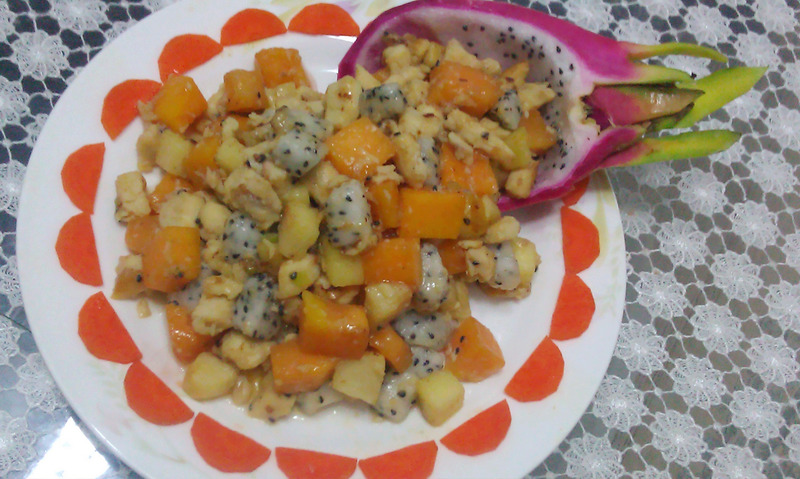 及以下步骤:用料:鸡脯肉150克 火龙果75克 苹果75克 木瓜75克 调料:盐、淀粉、料酒适量。 鸡脯肉切丁用淀粉、盐、料酒适量腌制15分钟。 用料:鸡脯肉150克 火龙果75克 苹果75克 木瓜75克 调料:盐、淀粉、料酒适量。 鸡脯肉切丁用淀粉、盐、料酒适量腌制15分钟。 用料:鸡脯肉150克 火龙果75克 苹果75克 木瓜75克 调料:盐、淀粉、料酒适量。 鸡脯肉切丁用淀粉、盐、料酒适量腌制15分钟。 龙果、苹果、木瓜去皮切丁。 炒锅置灶上预热加适量食用油中温下入鸡丁滑熟加食盐适量。 加入水果丁快速炒拌均匀加鸡精。 炒拌均匀成盘。