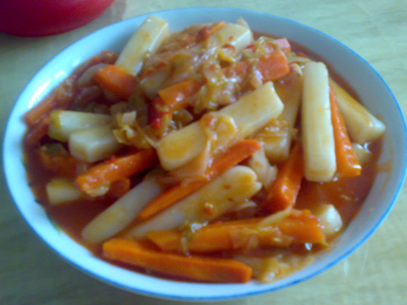 及以下步骤:锅内水开后倒入年糕翻炒均匀.大火煮沸.改小火慢炖..让年糕入味..其间不时搅动.以防粘锅. 做好的辣炒年糕. 准备所有材料(番茄酱忘记放下去拍) 洋葱.红萝卜.包菜切成条状. 年糕解冻清洗后沥干水分备用. 锅内加热油后.放洋葱炒出香味. 加入红萝卜炒匀后再加入包菜同炒至包菜变软. 倒入3勺番茄酱和1勺辣椒酱同炒入味后加入水.加盖煮沸. 锅内水开后倒入年糕翻炒均匀.大火煮沸.改小火慢炖..让年糕入味..其间不时搅动.以防粘锅. 做好的辣炒年糕.
