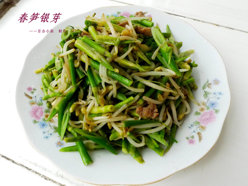 绿豆芽(适量) / 嫩春笋(适量) / 炒好的猪里脊肉丝(适量)