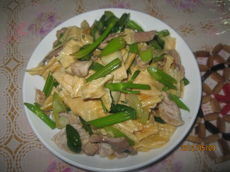 及以下步骤:撒生抽和盐,翻炒起锅 百吃不厌的家常菜 腐竹泡软,切小段,辣椒,西芹切段 肉片用生粉,植物油,盐,糖,生抽淹10分钟 爆香大蒜,然后关火把油温降下来 再开中火,放肉片下去滑炒,要撒点白酒 下辣椒和西芹翻炒出香味 加腐竹进去炒几下,加半碗水煮3分钟 撒生抽和盐,翻炒起锅 百吃不厌的家常菜