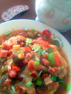 1、预处理:将豆腐切厚约半公分的四方块 皮蛋和火腿切小丁 青红椒和洋葱切小片 鸡蛋打散