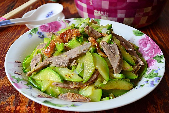 都说女儿象娘,一点也没错! 我妈妈平常就喜欢吃带皮的瓜,传到我也是这个爱好。 妈妈说,带皮的瓜不打药水,如冬瓜,南瓜,丝瓜,西葫芦瓜----- 西葫芦具有清热利尿、除烦止渴、润肺止咳、消肿散结的功效,常吃西葫芦,对于抽烟的人还很有好处的。 昨天吃剩了一些烤鸭肉,今天拿来炒西葫芦,营养好,味道也好。