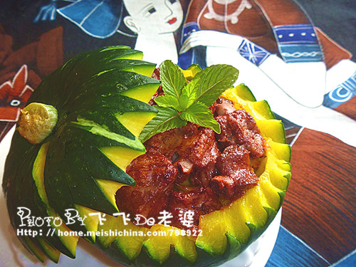 7、炒好后盛出,放入蒸熟的金瓜器皿中。