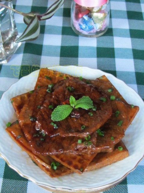 料酒(一勺) / 植物油(一勺半) / 小葱(少许) / 白糖(两茶匙) / 老抽(一勺) / 椒盐粉(少许) / 八角茴香(半个(三瓣))) / 薄香干(四块)