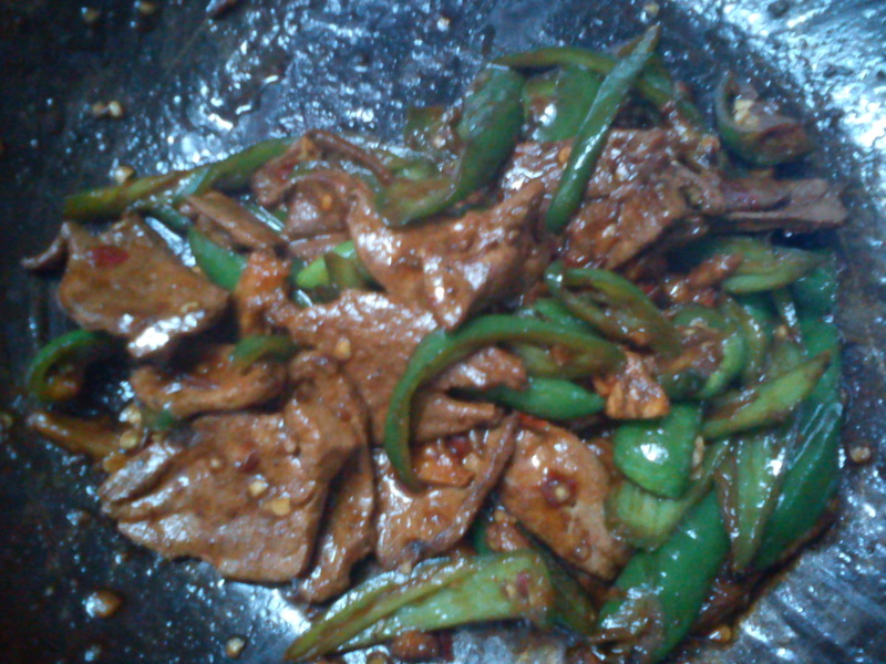 4、看着猪肝7成熟...就放青椒..爆炒..加适量盐...放水翻炒...要快//不要给他糊锅