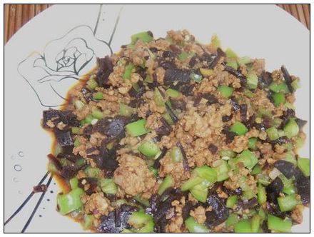 4、放入青椒煸炒约1分钟,这道云南名菜黑三剁就做好了。