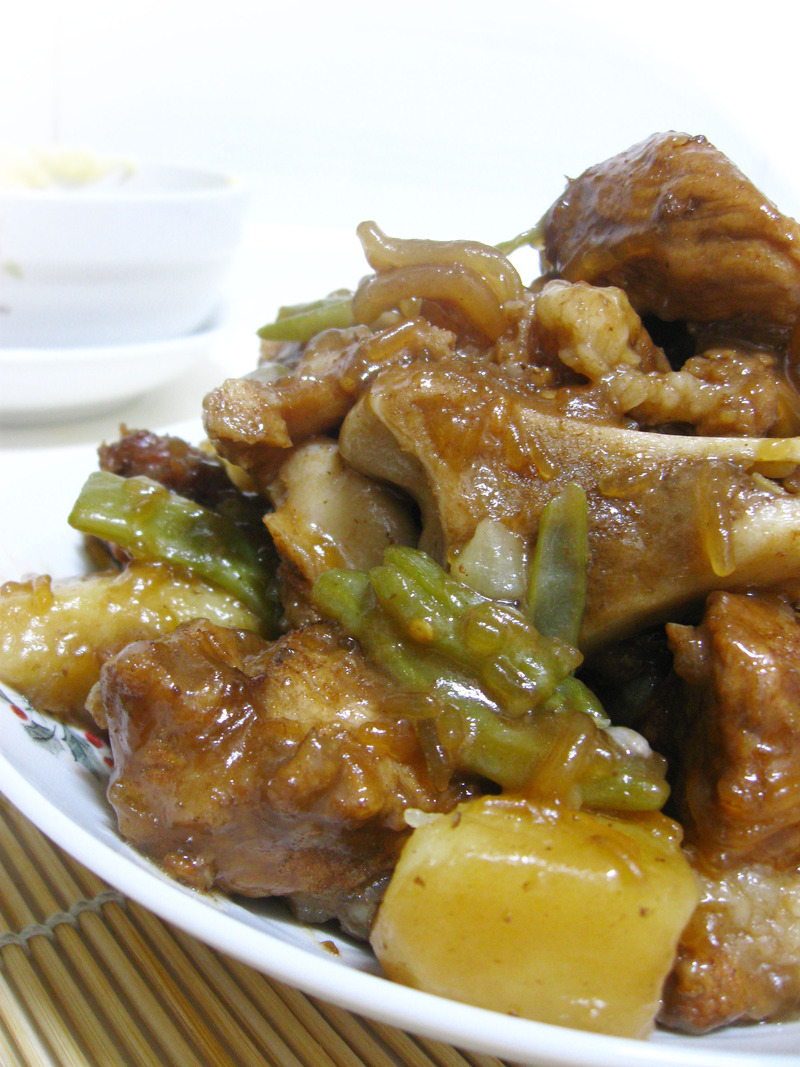 每天最犯愁的事就是晚上回家吃什么?想来想去好像所有的菜都吃腻了。翻开冰箱看到有一包冷冻的肉肉,跟老公研究了好久不知道这包到底是买回来剁好的鸡腿呢还是腔骨。后来脑子终于开窍了,解冻一下不就知道了。如果是鸡腿就做小鸡炖粉条,如果是腔骨就用豆角炖!原来是腔骨,拿了一个土豆、一把豆角,最后再放点粉条子乱炖吧!写菜谱的时候我还在想,这个到底算是东北乱炖呢,还是私房菜,q了一下老公,问他他家乡的东北乱炖是不是我做的这样,他说不是,那就是私房菜吧!