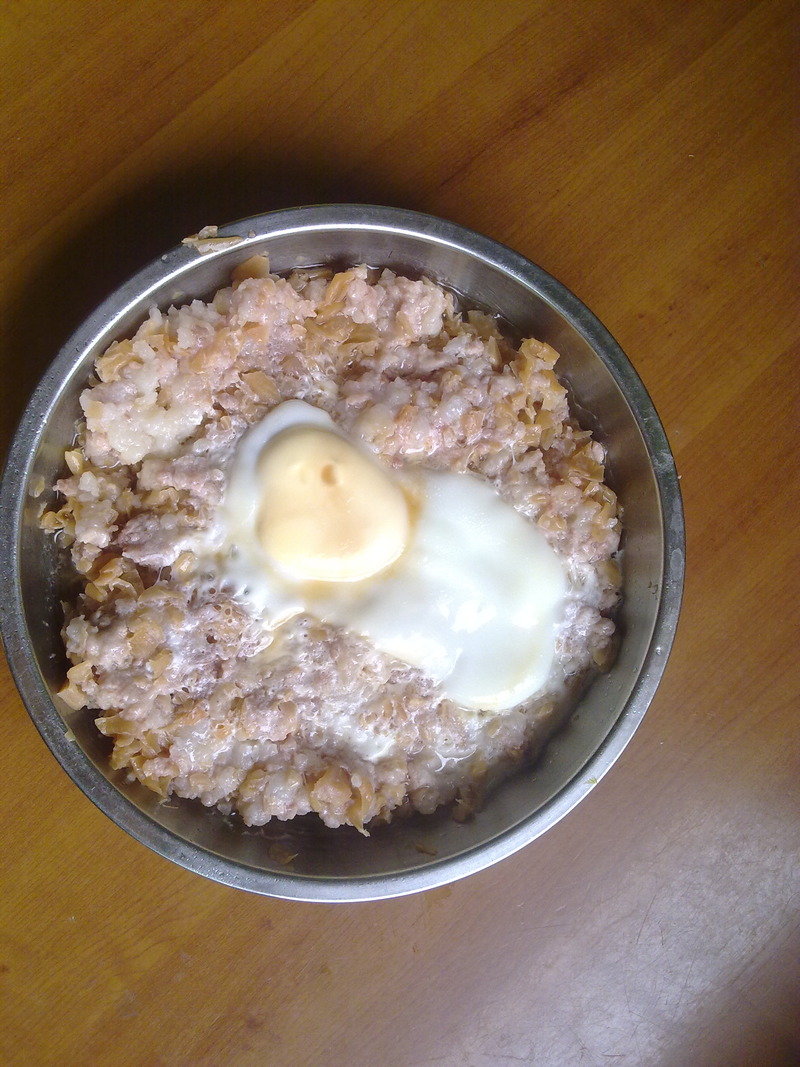 2、把剁好冬菜猪肉装到盘子里,压扁,然后加一个蛋上去