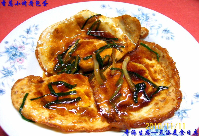 《香葱小烤荷包蛋》是根据上海葱烤类菜肴烹饪之精髓创意,并采用2010年10月30日收到的,美食家9月13日-10月16日【双节同庆】有奖征文奖品《爱仕达易v8128洁不粘煎锅》全程煎制的‘葱香鲜味’的荷包蛋,色香味形俱全,葱香四溢,鲜香扑鼻,营养丰富,口感极佳。 《香葱小烤荷包蛋》的命名: 是根据,食材名称、上海葱烤类菜肴之制作方法,菜式成品的色形而创意命名。 烹饪方法简介: 1、鸡蛋打入煎锅,蛋黄在撒入适量细盐,将蛋煎至六至七分熟; 2、加入香葱段略煸后,淋入料酒、老抽、白砂糖、鲜辣粉和适量清水,盖上锅盖煎烤至香气扑鼻香葱味溢出,再收汁调味勾芡即可装盘。 特点: 1、采用上海特色菜‘葱烤类’菜肴的烹饪方法,烹饪‘荷包蛋’,口感和营养均有提升,滋味独特; 2、食材配置合理,营养均衡,烹饪简单,色香味形俱全,菜名贴切顺口; 3、此菜简便、快捷,最适宜白领等事业繁忙群体,用此菜盖浇在米饭上,可成为‘葱烤鸡蛋盖浇饭’,盖浇在光面(清水面条)上,便可成为香葱烤蛋盖浇面,用作早餐夹饼、夹馒头、面包均是最好的拍档。 营养: 1、鸡蛋:鸡蛋黄中的卵磷脂、甘油三脂、胆固醇和卵黄素,有助于神经系统和身体发育,卵磷脂可促进肝细胞的再生,还可提高人体血浆蛋白量,增强机体的代谢功能和免疫功能,鸡蛋中含有较多的维生素b2,可以分解和氧化人体内的致癌物质含,有人体所需要的所有营养物质,营养学家称之为完全蛋白质模式,是不少长寿者的延年经验之一。 2、香葱:细香葱[香葱,四季葱]食物营养价值高,有很多种菜系佳肴做法。细香葱无论蒸煮,清炖,还是烧卤,煎炸,都风味香浓,营养丰富。细香葱还具有较高的食疗营养价值。 注意:鸡蛋蛋白烧焦,不益健康! 现将《香葱小烤荷包蛋》的食材配置加工制作图解上传与亲们分享。 愿,美食常伴左右,人人福寿安康!