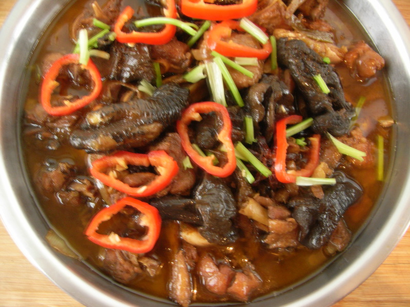 母亲节,全家老少齐聚一堂,给我老伴过节。原先计划去饭店,我说不用,在家里做,既省钱,又安全,我又可以给我们节目增砖添瓦,在家里气氛又浓,何乐而不为。大家听了,一致赞同,这样,我主厨,其他人打下手。下午三点,家宴准备工作开始了。全家人都异口同声,先来个莱芜大盆炒鸡。 说起山东莱芜大盆炒鸡的由来,最早兴起位于莱芜城东北方的夹岭山。此山是莱芜通往著名瓷都山东淄博博山的必经之路。由于这段山路蜿蜒崎岖,重山叠嶂,人烟稀少,致使过路的司机、路人就餐困难,当地有头脑的人看准了这个商机。夹岭山家家户户都散养土鸡。这样,他们在风景秀丽的宽阔地带,搭起草棚,垒起土灶,就地取材,选用漫山遍野散养的土鸡,当着客人的面,现宰现杀,用漫山遍野的松枝野树小火炖制。客人喝着茶的功夫,一盆家常炒鸡就端上来了。只见酱红色的大块鸡肉配着褐色的野松莪,翠绿的嫩芹菜和柔软剔透的粉皮(现在芹菜有点老、粉皮有添加剂,都用绿色洋白菜代替了)散发着浓郁诱人的香气。吃着炒鸡,再点上几道或拌或炒的田间野菜,环视着迷人的奇山异景,呼吸着清新的空气,足以驱散一路风尘和疲惫。这种吃法伴随着汽车飞转的车轮越传越远,夹岭炒鸡的名气也越来越大,以至于城里人礼拜天,大小长假,带着家人和朋友,专门开车前来,到这里吃名鸡,游山玩水,流连忘返。