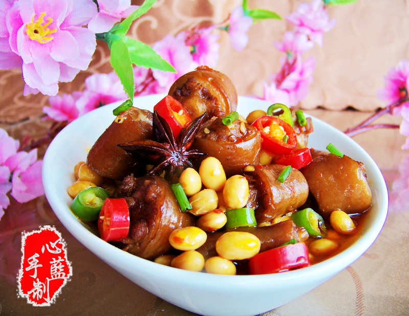 对于古时词人,心蓝只欣赏两位,一是苏轼,一是陆游,都是情种,都是情伤之人。 于苏轼,一阕《江城子》十年生死两茫茫。不思量,自难忘。千里孤坟,无处话凄凉。纵使相逢应不识,尘满面,鬓如霜。夜来幽梦忽还乡。小轩窗,正梳妆。相顾无言,惟有泪千行。料得年年肠断处,明月夜,短松冈那种无尽的相思让心蓝感同身受,越发能体会到《念奴娇·赤壁怀古》中遥想公瑾当年,小乔初稼了,雄姿英发,羽扇纶巾中那一丝欲隐欲现的惆怅和思念…… 于陆游,一阕《钗头凤·红酥手》红酥手,黄藤酒,满城春色宫墙柳。东风恶,欢情薄。一杯愁绪,几年离索。错、错、错。春如旧,人空瘦,泪痕红浥鲛绡透。桃花落,闲池阁,山盟虽在,锦书难托。莫、莫、莫。和着唐婉一阕《钗头凤·世情薄》世情薄,人情恶,雨送黄昏花易落。晓风干,泪痕残,欲笺心事,独语斜栏。难、难、难。人成各,今非昨,病浑常似秋千索。角声寒,夜阑珊,怕人寻问,咽泪装欢。瞒、瞒、瞒。道尽了爱慕情殇,哀怨缠绵。 看着碗中的黄豆煨猪手,心蓝觉得他们是幸福的。黄豆,焖煮后饱含猪尾的鲜汁,入口绵柔,恰似恋人的缠绵悱恻,浓情蜜意;猪尾,焖煮后附着黄豆的清香,入口即化,恰似恋人的如胶似漆,朝夕厮守。你中有我,我中有你,互为呼应,形影不离,完美的演绎了郎情妾意,长相厮守,伉俪相得,琴瑟相合的千古绝唱。 缥缈孤鸿影,寂寞沙洲冷。愁肠悱恻,只愿天下有情人终成眷属,莫让人间烟火染了衣。 楚人心蓝怅然收笔。
