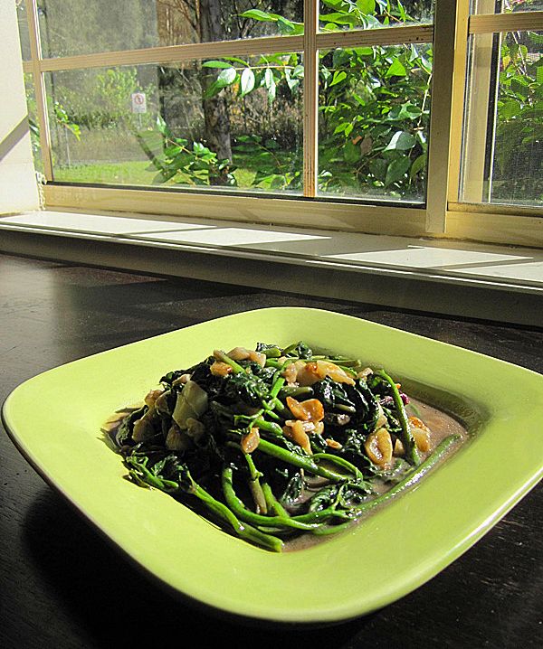 现代营养研究发现甘薯叶具有特殊风味和丰富营养,是多种蔬菜不可比拟的, 维生素c、b2、胡罗卜素及α-生育酚含量颇丰,是人体所需矿物质良好的供给源。据分析,番薯叶所含的胡萝卜素、维生素c、钙、磷、铁及必需氨基酸丰富,而草酸含量又很少。 番薯叶也含丰富的黄酮类化合物,能捕捉在人体内兴风作浪的氧自由基杀手,具有抗氧化、提高人体抗病能力、延缓衰老、抗炎防癌等多种保健作用。 另外,近代科学研究也表明,甘薯叶和块根中含有大量的液蛋白,能预防心血管系统的脂肪沉积,保持动脉血管的弹性,有利于预防冠心病,同时还能防止肝脏和肾脏中结缔组织的萎缩,保持消化道、呼吸道和关节腔的润滑。甘薯叶中富含的纤维还能加快食物在肠胃中运转,具有清洁肠道的作用。(内容来源网络) 这是我家院子外种的番薯,我嫌它不长番薯只长叶子就一气之下又将它们全部都拔掉了。只是看到那些嫩芽就这么扔掉似乎有点可惜,又把部分嫩芽摘下来。 只是这番薯叶炒出来的样子并不大好看,颜色有点深,可是绝对不影响它的美味,尤其是我用了咸虾酱,那味道可真的没说的,非常好!