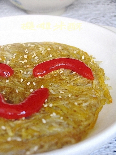 及以下步骤:继续小火烙至两面金黄后出锅,表面撒少许熟芝麻仁。根据个人喜好用番茄酱挤出图案即可上桌趁热食用。 土豆去皮洗净切丝,千万不要再过水清洗。 加入少许食盐。 土豆去皮洗净切丝,千万不要再过水清洗。 加入少许食盐。 加适量孜然粉。 充分搅拌均匀。 炒锅(最好是平底锅或不粘锅)倒少许油,涂抹均匀,稍热后倒入搅拌好的土豆丝整理成圆形。 小火加热至表面完全凝固后进行翻面。 继续小火烙至两面金黄后出锅,表面撒少许熟芝麻仁。根据个人喜好用番茄酱挤出图案即可上桌趁热食用。