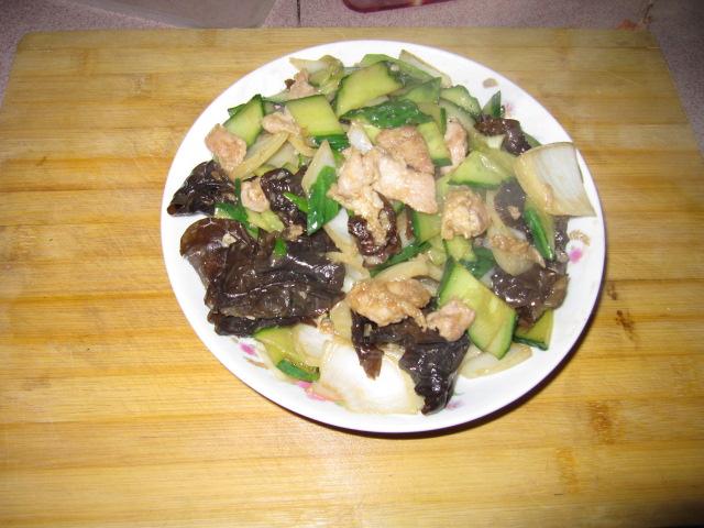 3、锅烧热放油大约5成热,下肉拨散推至旁边加葱姜蒜爆香,和肉翻炒并淋一些醋,加入辅料(黄瓜、木耳、洋葱)快速翻炒并将调好的汁加入,炒大约1分钟。好了,开动吧!