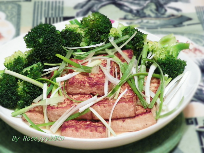 及以下步骤:将豆腐切成方块,约1-1.5公分厚,将豆腐平铺在方盘里,放水,放2汤匙蠔油、2汤匙生抽、1/2茶匙盐、1朵八角、约10粒花椒、放水,水能刚没过豆腐块,然后轻轻将盘晃几下,让水和调料融合,然后放入冰箱过夜; 平底锅置炉上,放少许油,轻轻将豆腐铺在平底锅上,中火煎至金黄色; 将豆腐切成方块,约1-1.5公分厚,将豆腐平铺在方盘里,放水,放2汤匙蠔油、2汤匙生抽、1/2茶匙盐、1朵八角、约10粒花椒、放水,水能刚没过豆腐块,然后轻轻将盘晃几下,让水和调料融合,然后放入冰箱过夜; 平底锅置炉上,放少许油,轻轻将豆腐铺在平底锅上,中火煎至金黄色; 将豆腐切成方块,约1-1.5公分厚,将豆腐平铺在方盘里,放水,放2汤匙蠔油、2汤匙生抽、1/2茶匙盐、1朵八角、约10粒花椒、放水,水能刚没过豆腐块,然后轻轻将盘晃几下,让水和调料融合,然后放入冰箱过夜; 平底锅置炉上,放少许油,轻轻将豆腐铺在平底锅上,中火煎至金黄色; 将豆腐切成方块,约1-1.5公分厚,将豆腐平铺在方盘里,放水,放2汤匙蠔油、2汤匙生抽、1/2茶匙盐、1朵八角、约10粒花椒、放水,水能刚没过豆腐块,然后轻轻将盘晃几下,让水和调料融合,然后放入冰箱过夜; 平底锅置炉上,放少许油,轻轻将豆腐铺在平底锅上,中火煎至金黄色; 两边煎至金黄色,葱切成毕或粒; 煎完豆腐不用洗锅,不浪费煎豆腐的油,加半锅水,水开1汤匙油和1茶匙盐,焯熟西兰花,放油盐是让西兰花有点底味,焯熟后滤水,围在豆腐旁边,豆腐面上铺上葱丝,可出品。