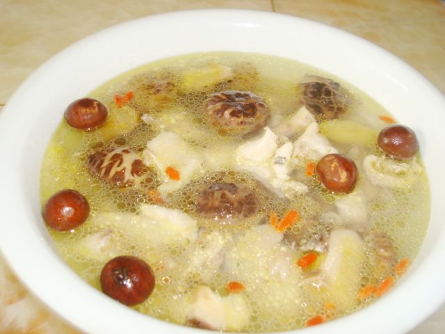 及以下步骤:补气血、养颜、提高免疫力 原料:土鸡 香菇 料酒 香叶 姜 盐 枸杞 桂圆 干山楂片(可以去腥味,鸡肉也熟的快) 干香菇用开水泡好 原料:土鸡 香菇 料酒 香叶 姜 盐 枸杞 桂圆 干山楂片(可以去腥味,鸡肉也熟的快) 干香菇用开水泡好 将土鸡洗净、切块。干香菇用开水泡好,洗净,大香菇要切块。 将土鸡放入凉水的瓦煲里,加香菇、姜、桂圆,香叶 料酒 干山楂 加盖大火烧开,改小火炖一小时 最后加枸杞、盐煮5分钟即可。 补气血、养颜、提高免疫力