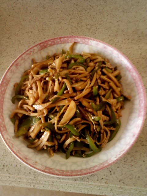 盐(适量) / 白糖(1勺) / 鸡精(适量) / 青椒(1个) / 猪肉(1两) / 淀粉(适量) / 醋(2勺) / 老抽(1勺) / 葱姜蒜(适量) / 辣椒油(适量) / 香油(麻油)(适量)