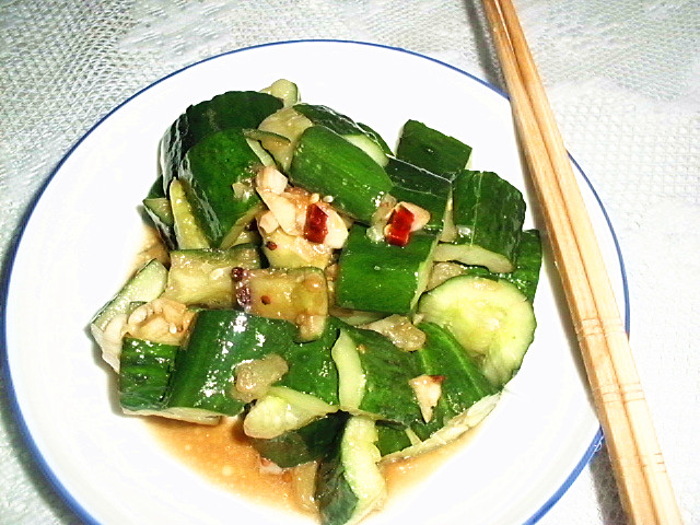 及以下步骤:加入少许酱油翻炒。 最后淋点醋炒匀即可。 准备食材。黄瓜洗净,干辣椒切碎,大蒜子切片。 黄瓜切段、拍散。 热锅凉油、小火,爆香大蒜子、干辣椒。 放入黄瓜段。 改大火爆炒。 搁盐调味,翻炒均匀。 加入少许酱油翻炒。 最后淋点醋炒匀即可。
