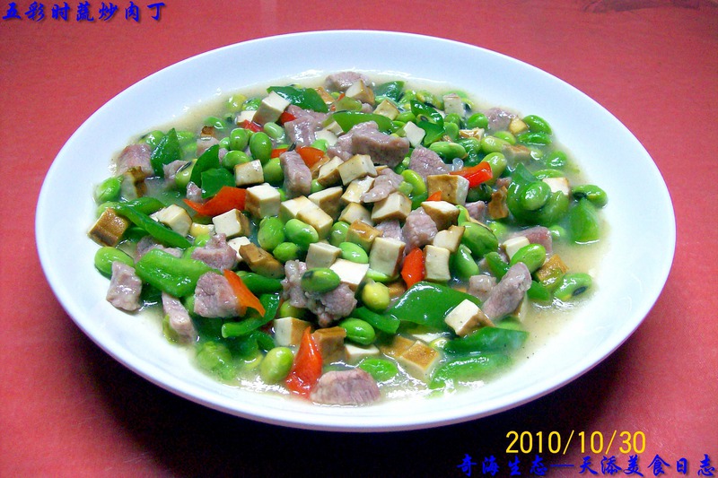 及以下步骤:浆制好的猪肉丁,入锅滑炒至变色即可。 将过油后的青红椒、肉丁装盘备用。 锅内加入毛豆略煸炒变色,再加入香干同时煸炒片刻。 加入适量清水、食盐。注:此时加盐毛豆不易变黄。 盖上锅盖用大火烧开,然后,用中火略焖片刻。 待毛豆七分熟时加入肉丁、青红椒翻炒、调味、收汁、勾芡即可。 《毛豆香干炒肉丁》成品图。 《毛豆香干炒肉丁》成品图。 《毛豆香干炒肉丁》成品图。 《毛豆香干炒肉丁》成品图。