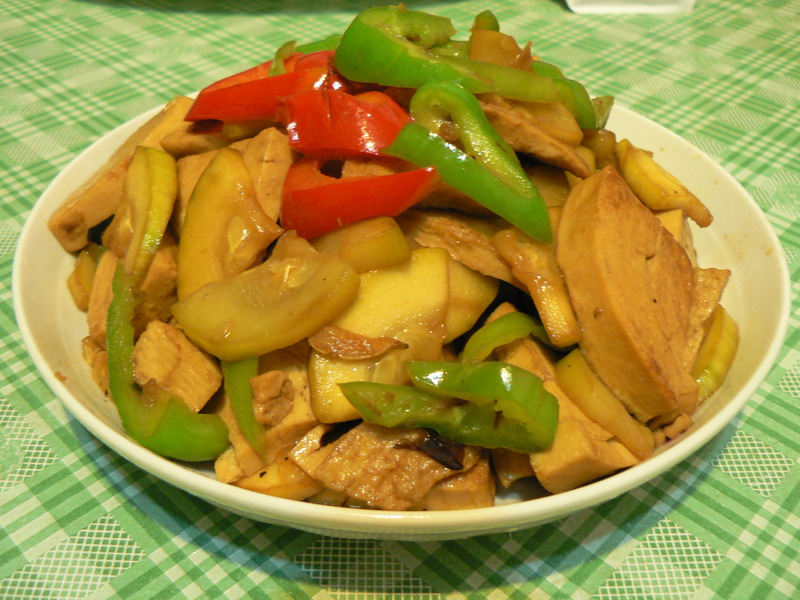及以下步骤:倒入西葫芦片。 然后向炒锅内烹入适量醋、酱油和生抽,加少许盐、鸡精和黑胡椒粉,用大火翻炒均匀。 把青红椒放入,稍微再炒一下。 装盘就可以了。 炒锅添油,先用小火爆香葱姜。 放入素鸡片,调成大火翻炒。 倒入西葫芦片。 然后向炒锅内烹入适量醋、酱油和生抽,加少许盐、鸡精和黑胡椒粉,用大火翻炒均匀。 把青红椒放入,稍微再炒一下。 装盘就可以了。