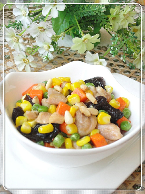 及以下步骤:锅中加入适量的色拉油加热。 倒入腌制好的鸡肉丁翻炒。 炒到鸡丁能弹起、水份变少即可。 先把木耳和玉米粒倒入锅中翻炒一会儿。 在加入胡萝卜丁和豌豆粒翻炒一会儿。 加入少许的水翻炒一下。 加入适量精盐炒匀。 加入少许的胡椒粉炒匀。 加入适量的水淀粉,翻炒至水淀粉包裹住食材即可。 加入松子仁关火后,加入适量的鸡精(不加也很鲜美的)