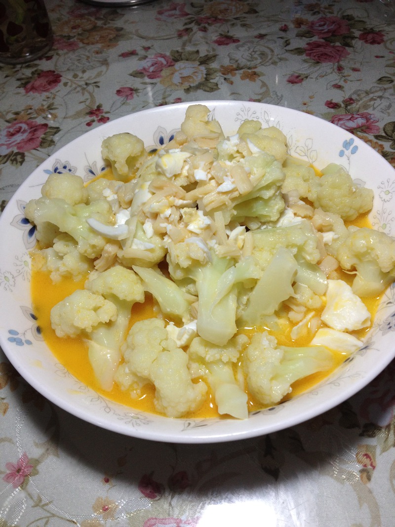昨天熬鸡汤时,特意留了点汤做高汤,今天就派上用场了,用鸡汤煮的花菜,鲜得嘞。。。