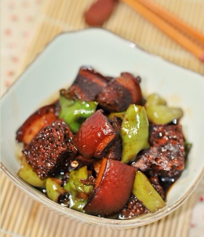 7、烧到肉肉全部软软烂烂入味了,汤汁也浓浓的了,就把两个切片的青椒放进去,开大火炒到青椒软,翻炒收汁