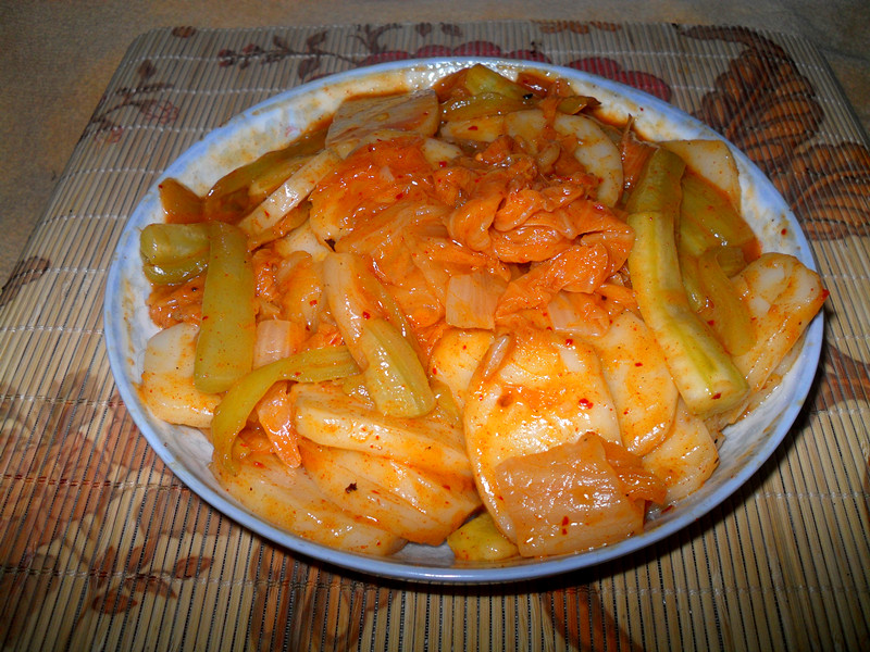 6、最后倒入辣白菜。