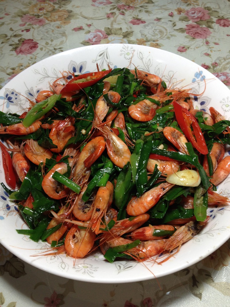 韭菜(120克) / 青红椒(各2个) / 河虾(250克)