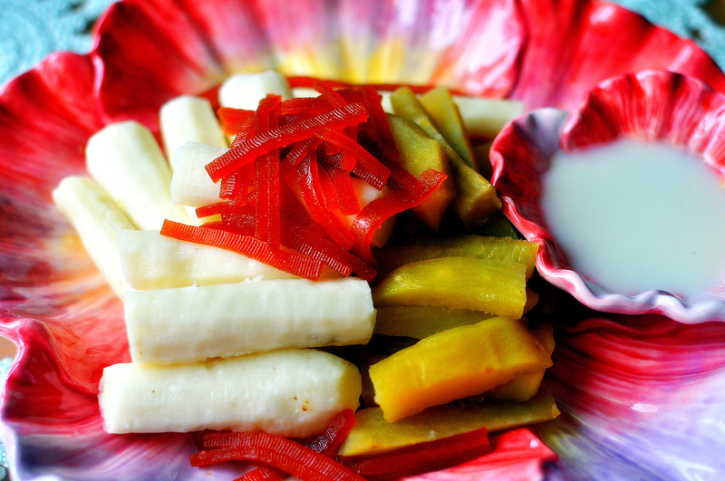 7、主料:山药、红薯。配料:京糕(山楂糕)、炼乳、砂糖。把山药、红薯去皮切寸条,京糕切丝备用。