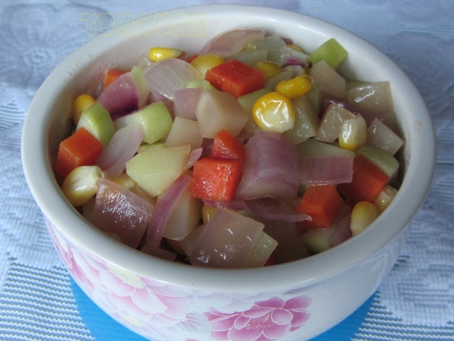 别小看这些蔬菜哦,洋葱被称为蔬菜皇后;玉米中含有一种长寿因子······每样食材都有它的营养价值不是?炒在一起是懒惰的做法,但也合乎营养互补。 我最喜欢将五颜六色的素丁炒在一起吃了。我家人物宝贝在家时,对我做的菜不挑食。常常要问,老妈,今天这叫什么菜名?我总是随口说一个名称,有时说:春色满园,有时说五彩缤纷等。记得高考前的一次我说了个:锦绣前程。
