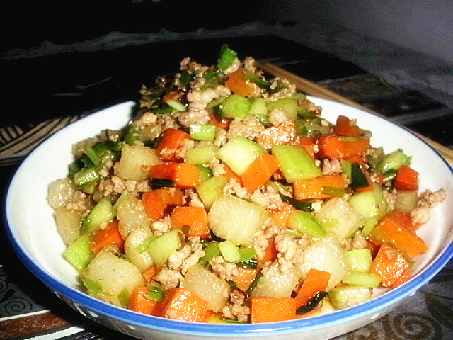 及以下步骤:加点开水焖烧1分钟。 放入韭菜头、搁盐炒匀。 最后倒入黄瓜炒匀即可。 热锅凉油,小火将肉糜炒出油。 放入黄豆酱。 放入胡萝卜煸炒。 加入山药煸炒。 加点开水焖烧1分钟。 放入韭菜头、搁盐炒匀。 最后倒入黄瓜炒匀即可。