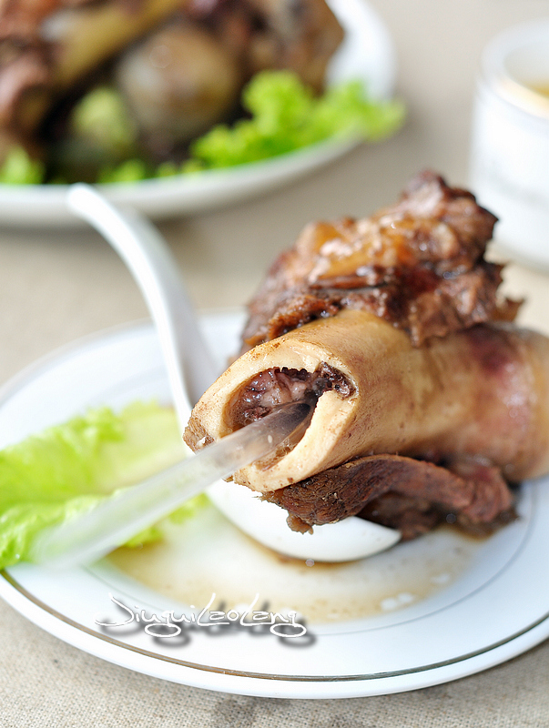 有那么几种美食让你面对时总是无法矜持、无法淑女,酱大骨算是一名。酱大骨是名豪迈的汉子:粗粗壮壮、面色红润,肥而不腻,还特有内涵 ---- 骨髓也是很鲜美的。 一般在知道了点好了酱大骨这道菜的时候,大家都会洗手恭候的,等到炖制好的飘着浓浓酱香的酱大骨一上桌,大家都不会谦让很多,因为吃酱大骨你是无法优雅矜持的。经过酱制的猪骨香而不腻,吃起来是满口留香、姿势豪迈:左啃啃、右啃啃... ...最销魂的是用吸管把浓香的骨髓吸进嘴里的那一刻:一股浓香直冲脑门。 酱大骨是把猪大腔骨从中间斩断,用冷水浸泡数小时后加香料小火慢炖而成的一个酱香浓郁的美食。做酱骨注意的是猪骨的处理和炖制的香料。猪骨去血水要采用长时间冷水浸泡,可以更好的保持肉味。如果采用焯水的办法,因原料较大、较多,需要经较长时间的煮炖才能将血水除净,这样容易造成肉味的损失。