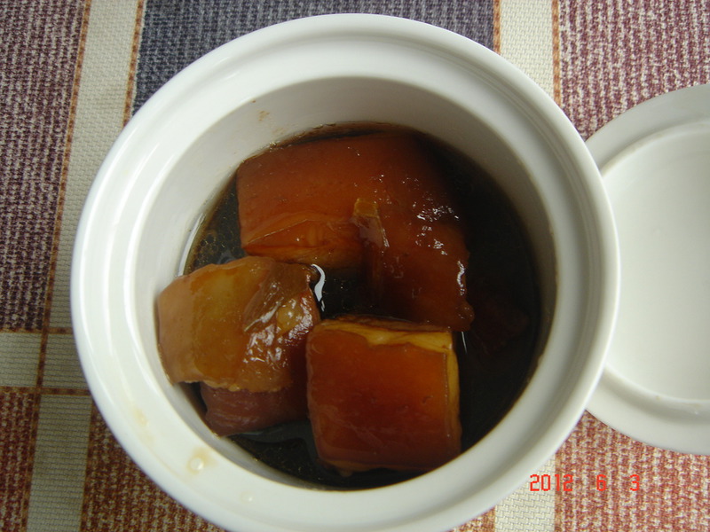 及以下步骤:砂锅底铺草垫(防粘锅),上铺葱、姜片。 猪五花肉800克,切成2厘米见方块。 砂锅底铺草垫(防粘锅),上铺葱、姜片。 猪五花肉800克,切成2厘米见方块。 砂锅底铺草垫(防粘锅),上铺葱、姜片。 猪五花肉800克,切成2厘米见方块。 砂锅底铺草垫(防粘锅),上铺葱、姜片。 将切好的五花肉下开水锅煮五分钟,去除腥味和血沫。让后皮朝下整齐码放在砂锅内。 添加绍兴花雕。此步甚为关键,用黄酒才能煮出特有的香味。 砂锅内加入黄酒、老抽、生抽和冰糖,加盖大火烧开然后转微火烧制2.5小时,待汤汁浓稠红亮后关火取出放入炖盅再上锅蒸20分钟即可。